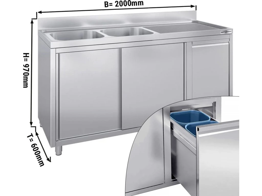 Szafka pod zlewozmywak - 2000x600 mm - z pojemnikiem do odpady & 2 zlewami po lewej stronie
