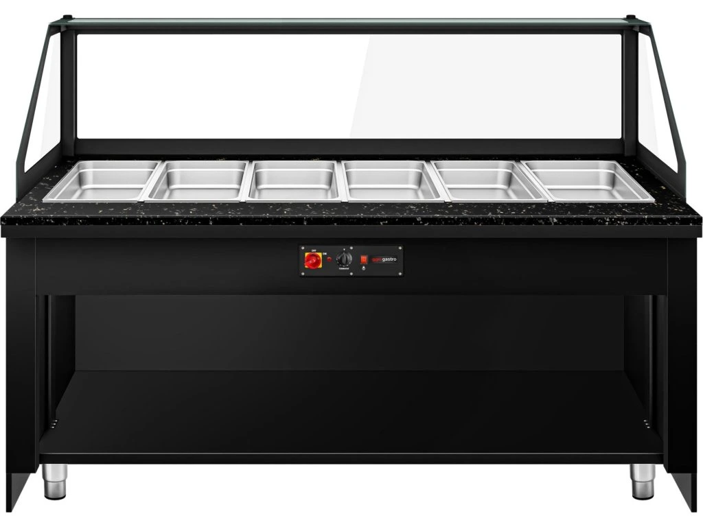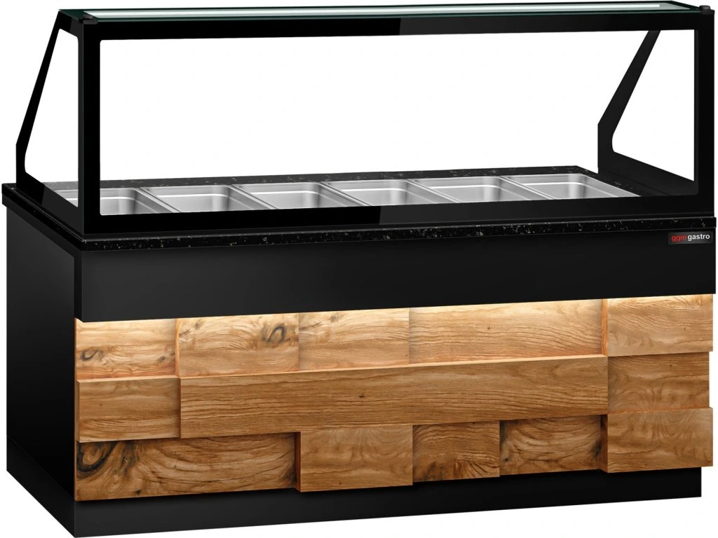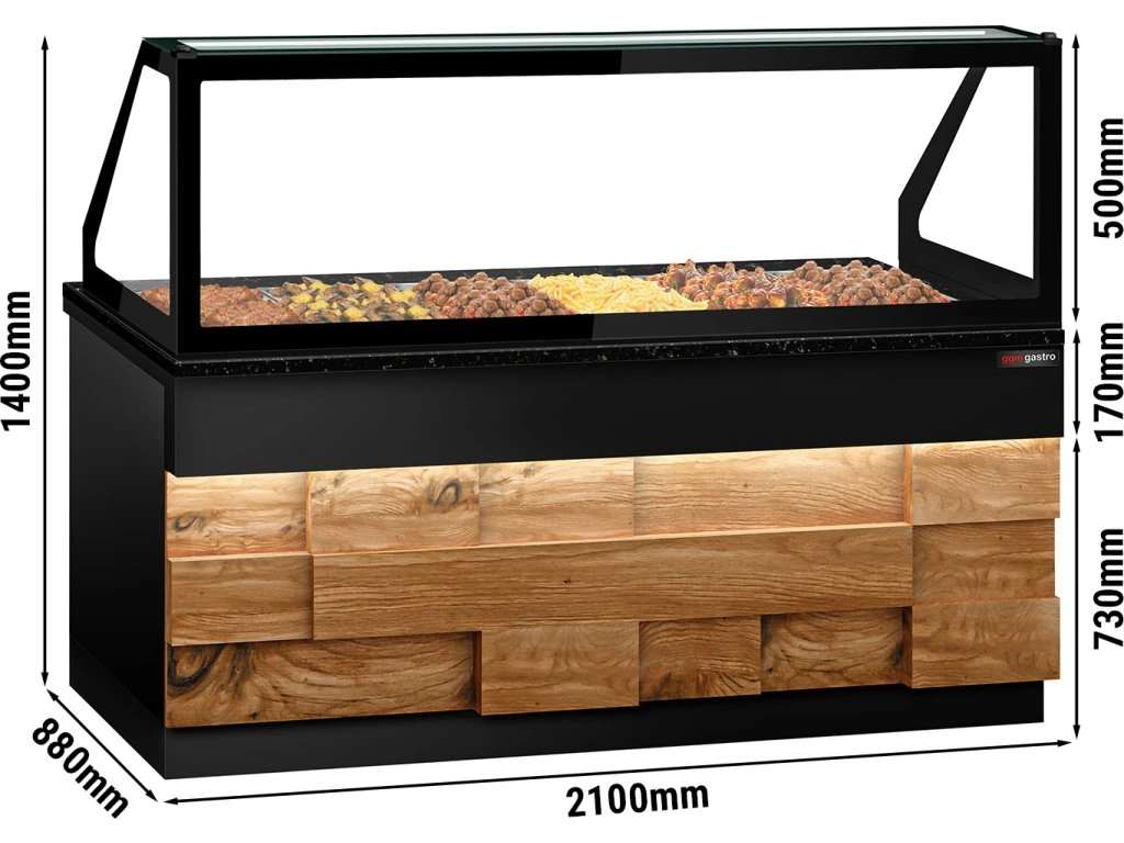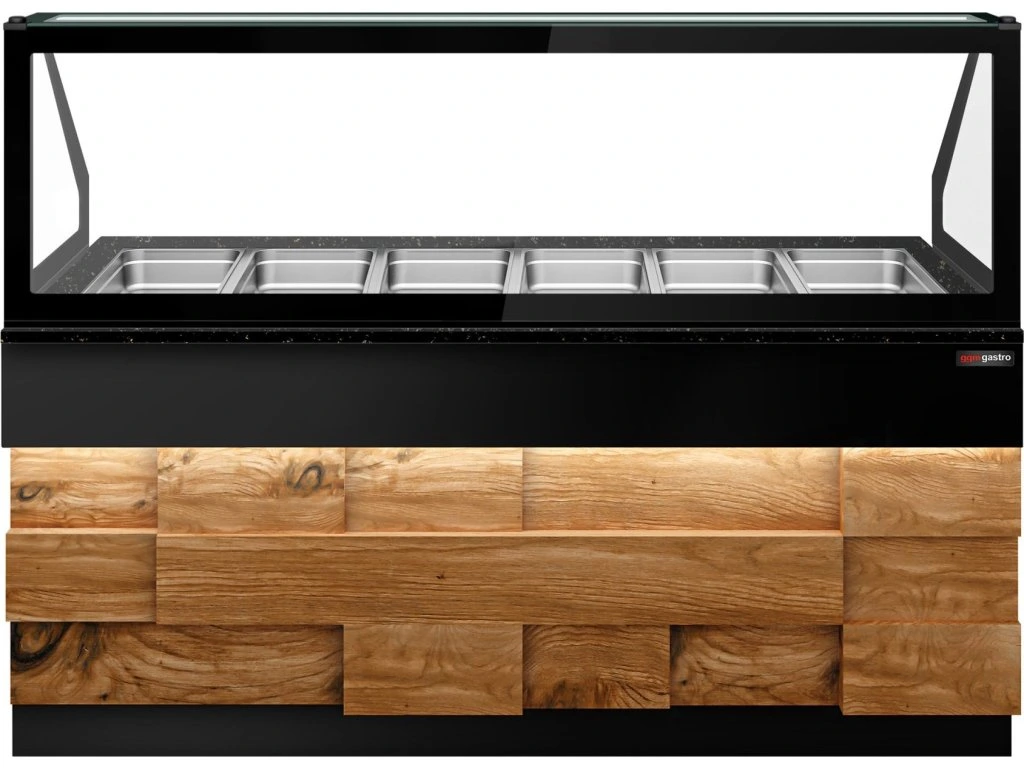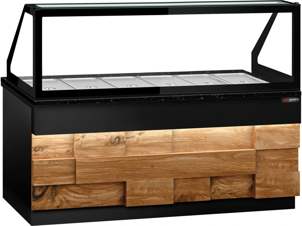 Witryna grzewcza TORONTO - 2100 mm - drewniany panel przedni - dla 6x GN 1/1 - blat z czarnego granitu