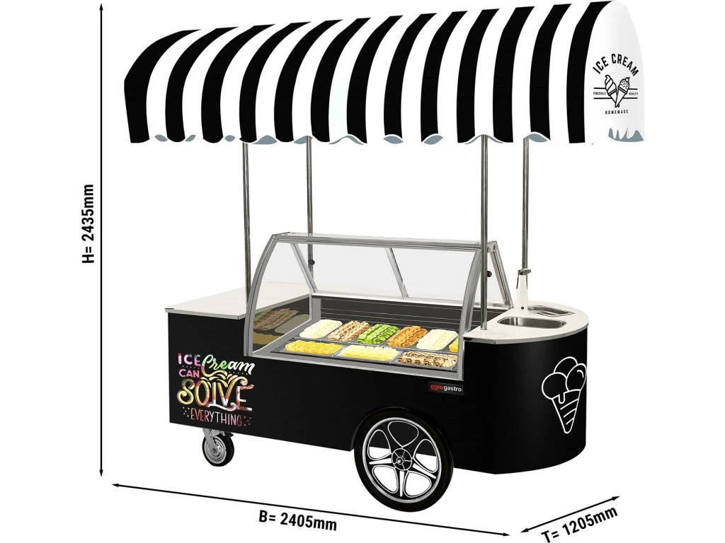 Wózek na lody - 2146 mm - ze zlewem & okrągłą ladą na lody - 9 pojemników na lody o pojemności 5 litrów