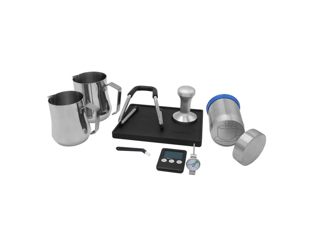 Zestaw baristy - 10-częściowy - w tym 2 dzbanki na mleko, tamper, szczoteczka, minutnik i termometr