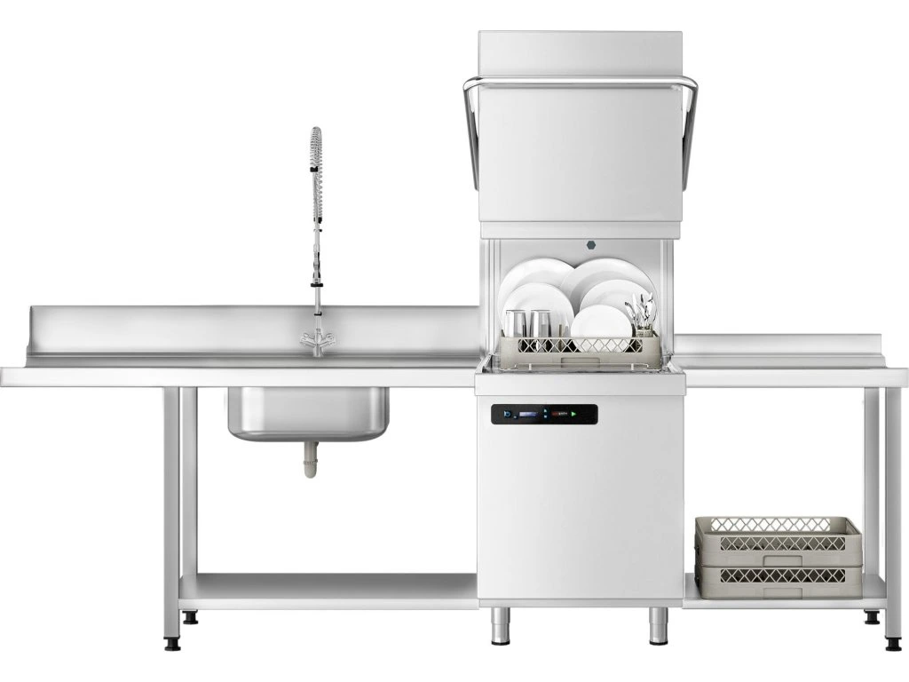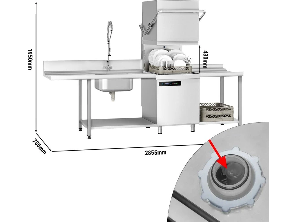 Zmywarka kapturowa - cyfrowa - 7,1 kW - włącznie ze stołem wlotowym z prawej strony, stołem wylotowym z lewej strony & odkamieniaczem - z detergentem, nabłyszczaczem & pompą spustową